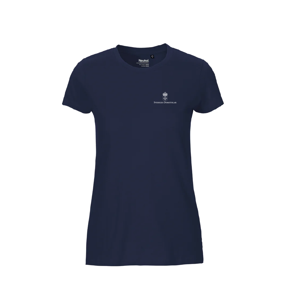 T-shirt Dam, mörkblå. En modern och skön t-shirt i slim passform. 100% Ekologisk Fairtrade bomull - 155gsm. Ringspunnen kammad bomull. Pris inkluderar 1-färgstryck i vitt med Sveriges domstolars logotyp och det gemensamma vapnet för Sveriges Domstolar.